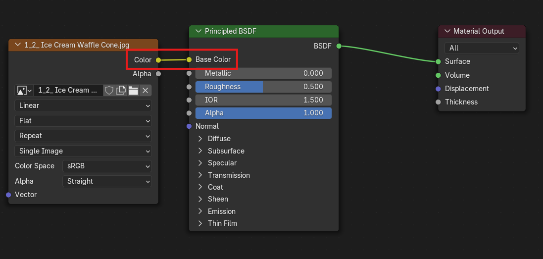You need to connect the “Image Texture” window to the “Material” window which opened first. You will see on both windows that there are yellow dots along the border. On the image texture window it will be the top dot on the right hand side next to “color” and on the material window it will be the yellow dot to the left of “Base Color”. Click on one of the circles and drag out to the other one, creating a line that attaches them and then let go once they have connected to one another like seen in the next example. Now you will see your pattern on the cone!