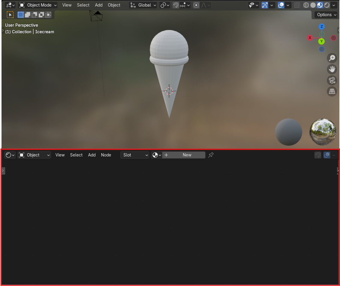 Locate the “Shader Editor”. If you look below the viewport where your objects are, you will see an empty window which in the top left has a couple options that say “Object” “View” “Select” “Add” etc…. Right now there is nothing in it because we have not added any “materials” to our models to edit. Select your icecream scoop by right clicking on it in the viewport so that there is an orange outline surrounding it.
