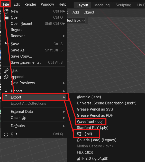 Now that you have created a model, you may want to export it to use it outside of Blender. You may want to 3D print your model or put it into other softwares.