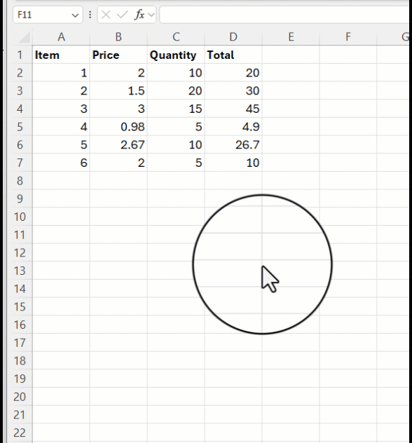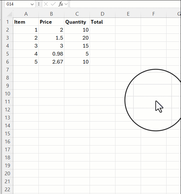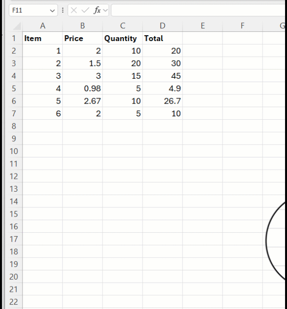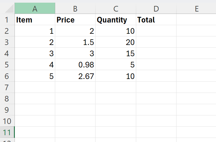 Now, if you add additional items at the bottom, Excel will automatically calculate their total value: