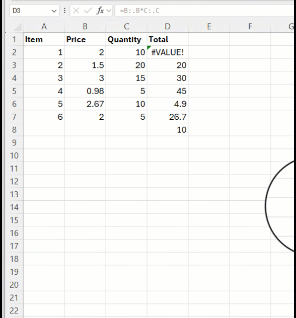 In this case, instead of selecting a large range for columns B and C, you can just select the entirety of columns B and C for the multiplication, and use the dot operator to remove the trailing set of empty cells. (Note: an error message saying “#VALUE!” is okay at this step, check the next step to understand why and how to fix it!)