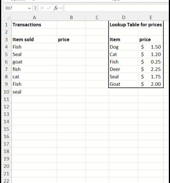 - Type in a few item names (like “Dog” or “Seal” for example) from the lookup table in field A11 and below.
