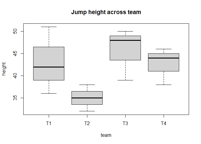 boxplot(height ~ team, data = df, main = "Jump height across team")