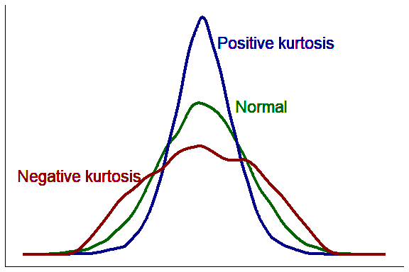 - Kurtosis characterizes the relative peakedness or flatness of a distribution compared with the normal distribution. Relatively peaked distribution are called “positive kurtosis” and indicated by values larger than 3 in the kurtosis estimator. Relatively flat distributions are called “negative kurtosis” and are indicated by values smaller than 3 in the kurtosis estimator.