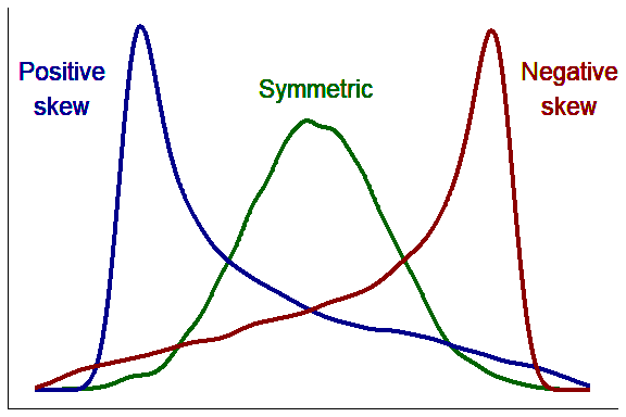 - Skewness characterizes the degree of asymmetry of a distribution around its mean. Positive skewness indicates a distribution with an asymmetric tail extending toward more positive values. Negative skewness indicates a distribution with an asymmetric tail extending toward more negative values.