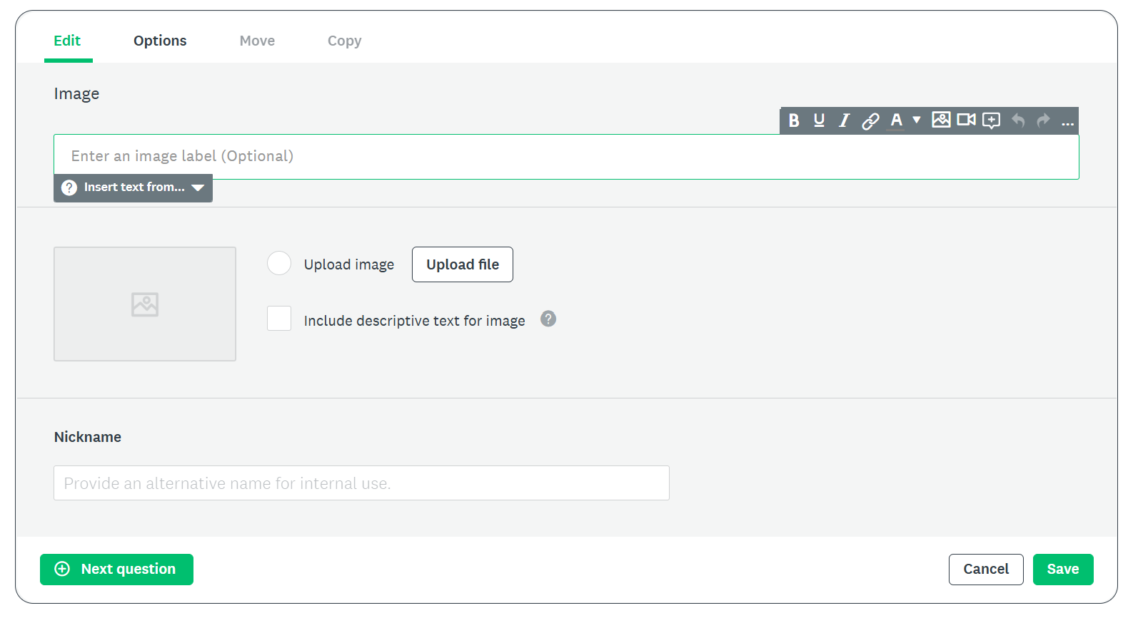 - For more information about adding images to your survey, check out this link: Adding Images using Survey Monkey