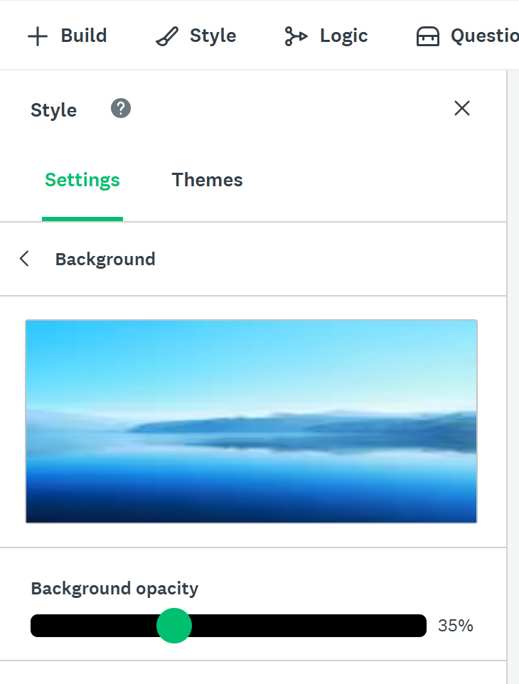 - You can modify the background opacity as well once you have added your image by clicking in the Background button under Style > Settings, and then moving the toggle side to side.